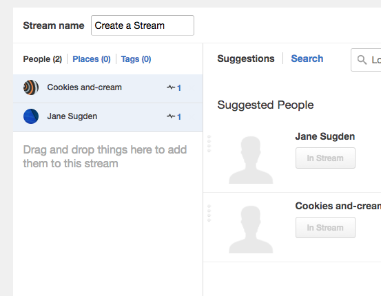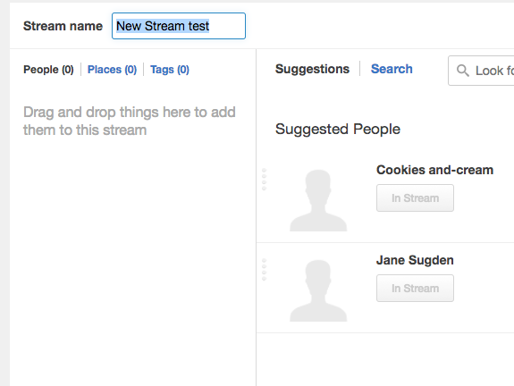 The New Stream pane does not update after adding new people, places, and tags to follow. The Add button turns into In Stream when clicked to confirm that the item has been added. However, the content is not being added to the New Stream pane on the right.
