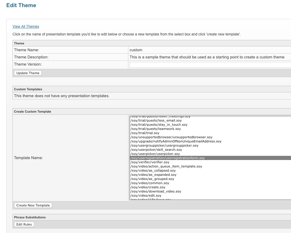 - Make the changes and press Save Template. On the Edit Theme page, the file now shows up in the list of Custom Templates.