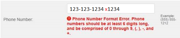 "Phone Number Format Error. Phone numbers should be at least 6 digits long, and be comprised of 0 through 9, (,), -, and +."