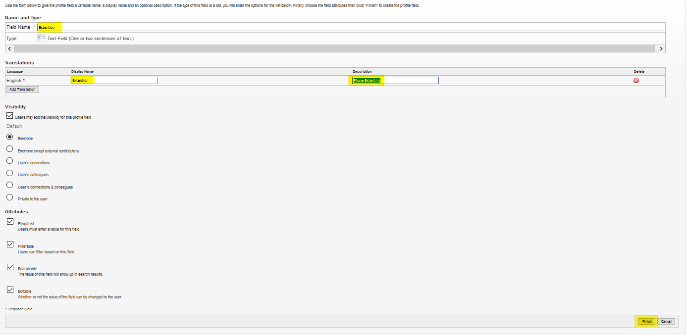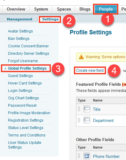 - To add Extension Number field in User Profile options: Go to People > Settings > Global Profile Settings > Create new field.