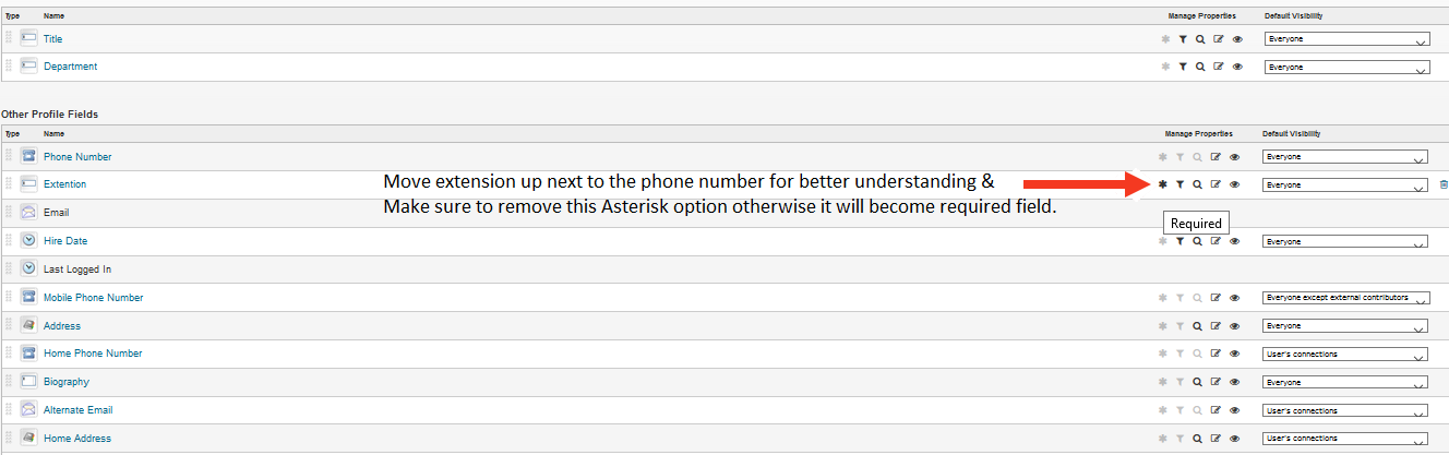 - Now you will find extension at the bottom of the profile fields move it up next to phone number:
