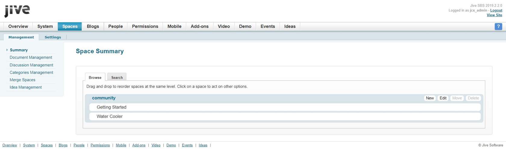 A Place in Jive is essentially a container that houses all the collaborative content for a specific subject or team. A Space, on the other hand, is a type of place, built in a hierarchy, with the ability to have a network of multi-level sub-spaces underneath it. This article provides information on how to create a new space from the Admin Console. Although you can create spaces from the user interface, it is easier to create several spaces quickly from the Admin Console.
