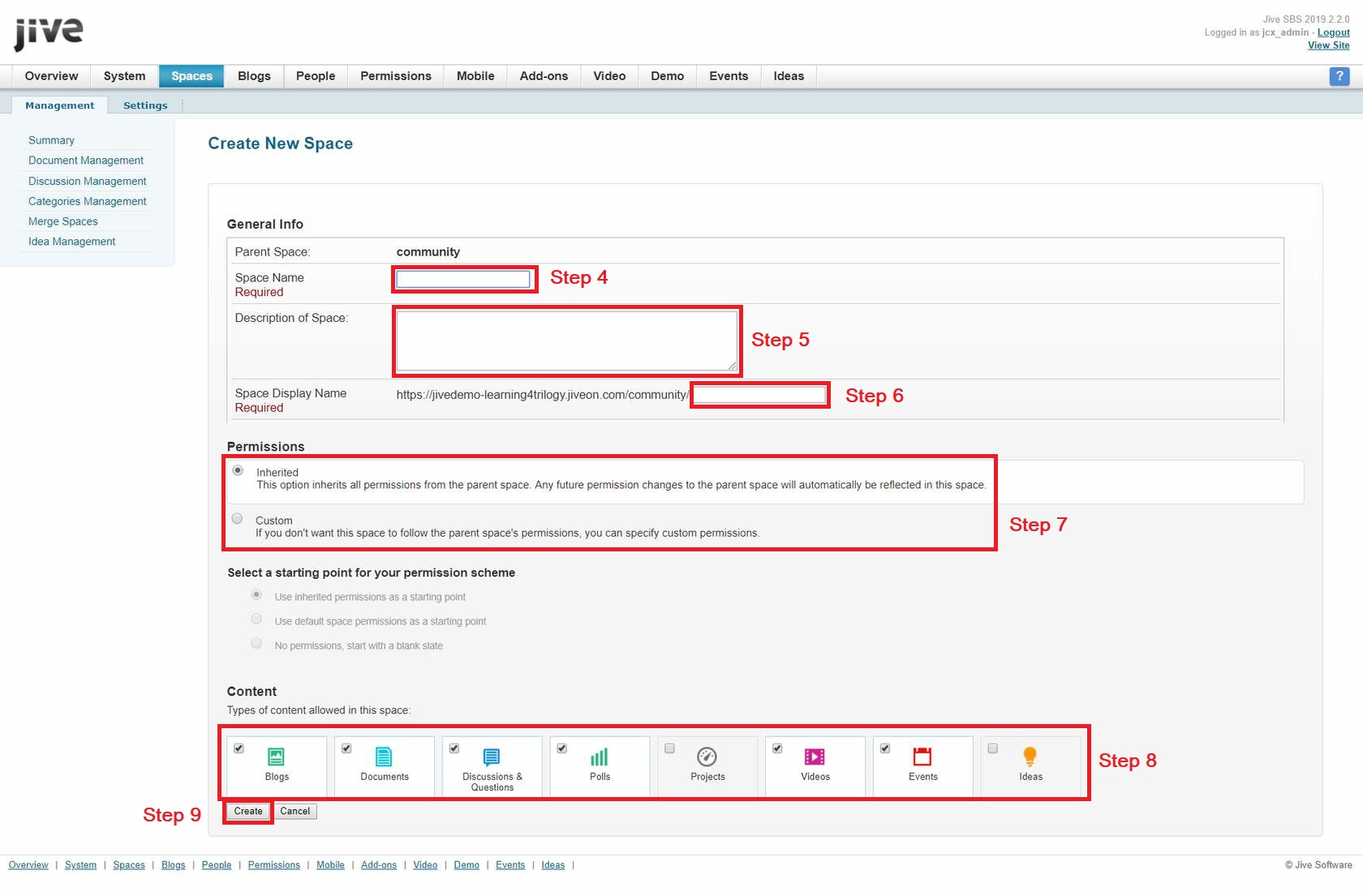 To create a space from the Admin Console, please follow the steps below.